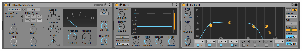 The bass in this track uses Waves Maserati B72 for some extra body, paired with Ableton’s Glue Compressor and an EQ to roll off both lows and highs — keeping it smooth, round, and simple. Sometimes, less really is more.